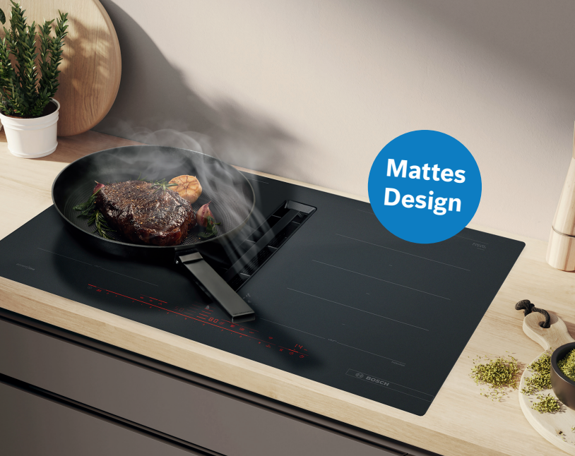 Die neuen Kochfelder mit integriertem Dunstabzug in Matt Design von Bosch vereinen moderne Ästhetik und höchste Funktionalität. Dank ihres reduzierten und eleganten Designs fügen sie sich perfekt in jede Küche ein und ermöglichen maximale Freiheit bei der Küchenplanung. Die matte Oberfläche reduziert die Sichtbarkeit von Kratzer und Fingerabdrücke deutlich und der PerfectFry Bratsensor und der Luftgütesensor sorgen für perfekte Kochergebnisse.